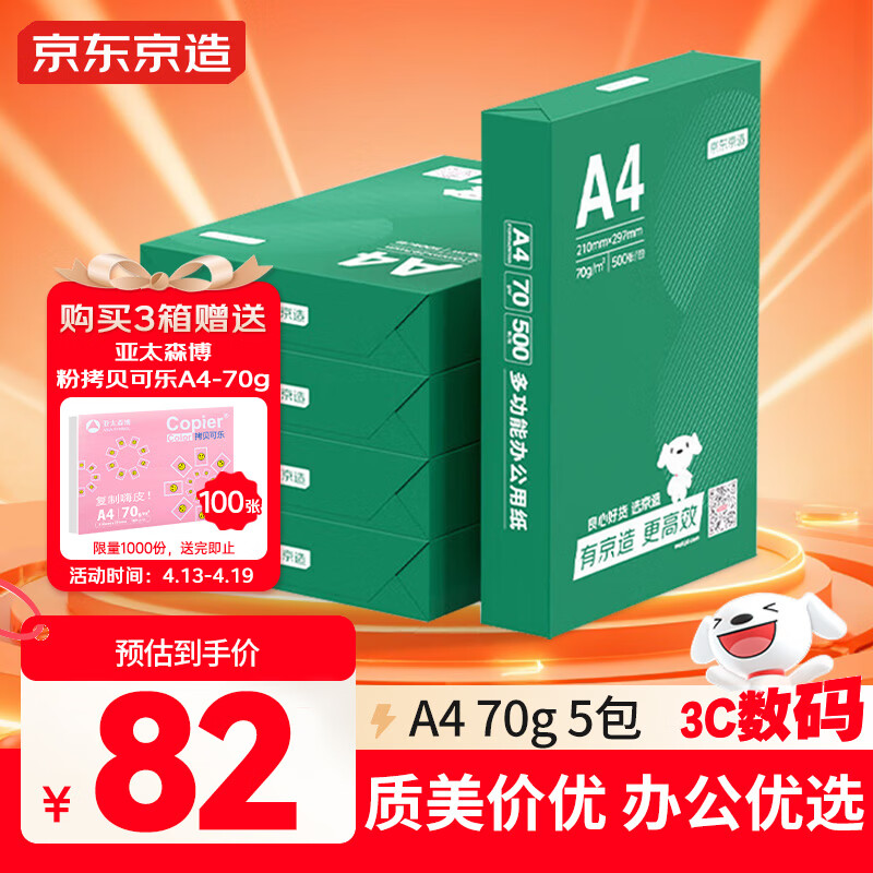 京东京造A4打印纸 70g复印纸 云水质享系列 双面草稿纸 500张/包 5包/箱 (2500张)【金榜推荐】