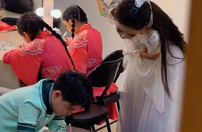 佟丽娅演出后台给小酒窝朵朵听写