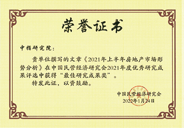 2021年《2021年上半年房地产市场形势分析》荣获中国民营经济研究会“最佳研究成果奖”