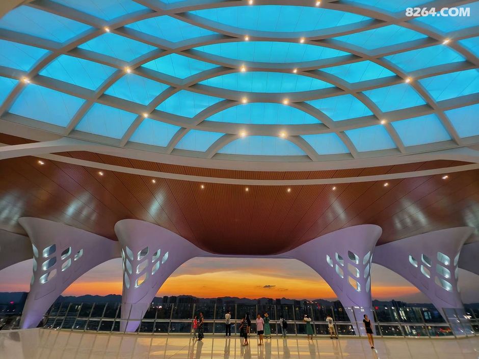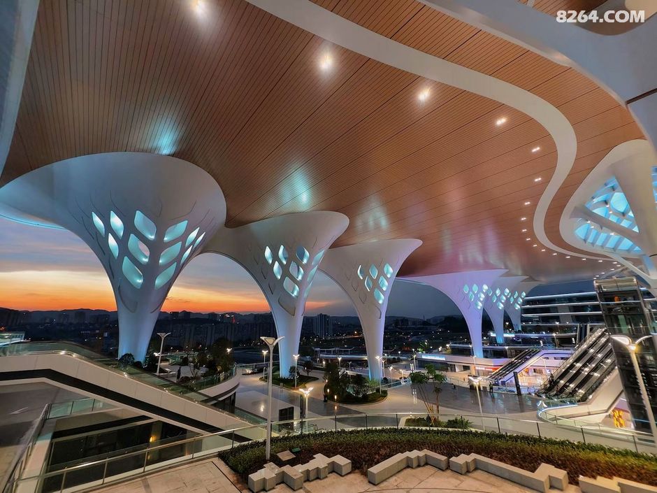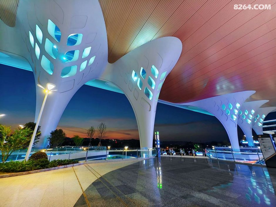 终于,我来到了传说中的西进站口,这里被誉为最美晚霞打卡点,此刻,这里已经聚集了不少人,大家都静静地等待着落日的降临。天边渐渐泛起了橙红色的光晕,太阳开始慢慢下沉,给东站的建筑披上了一层金色的薄纱,原本硬朗的钢筋铁骨瞬间化作温柔的剪影,立柱的剪影交错,与“山水巴渝”流线穹顶相互呼应,美轮美奂。我迅速按下快门,想要将这转瞬即逝的绚烂永远留存。
