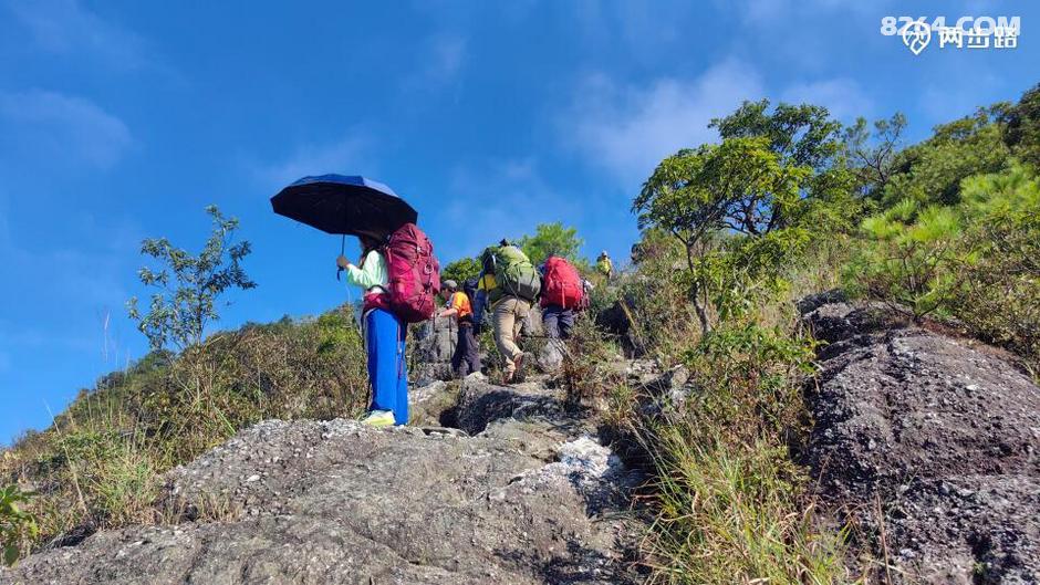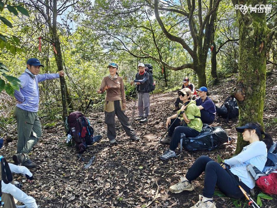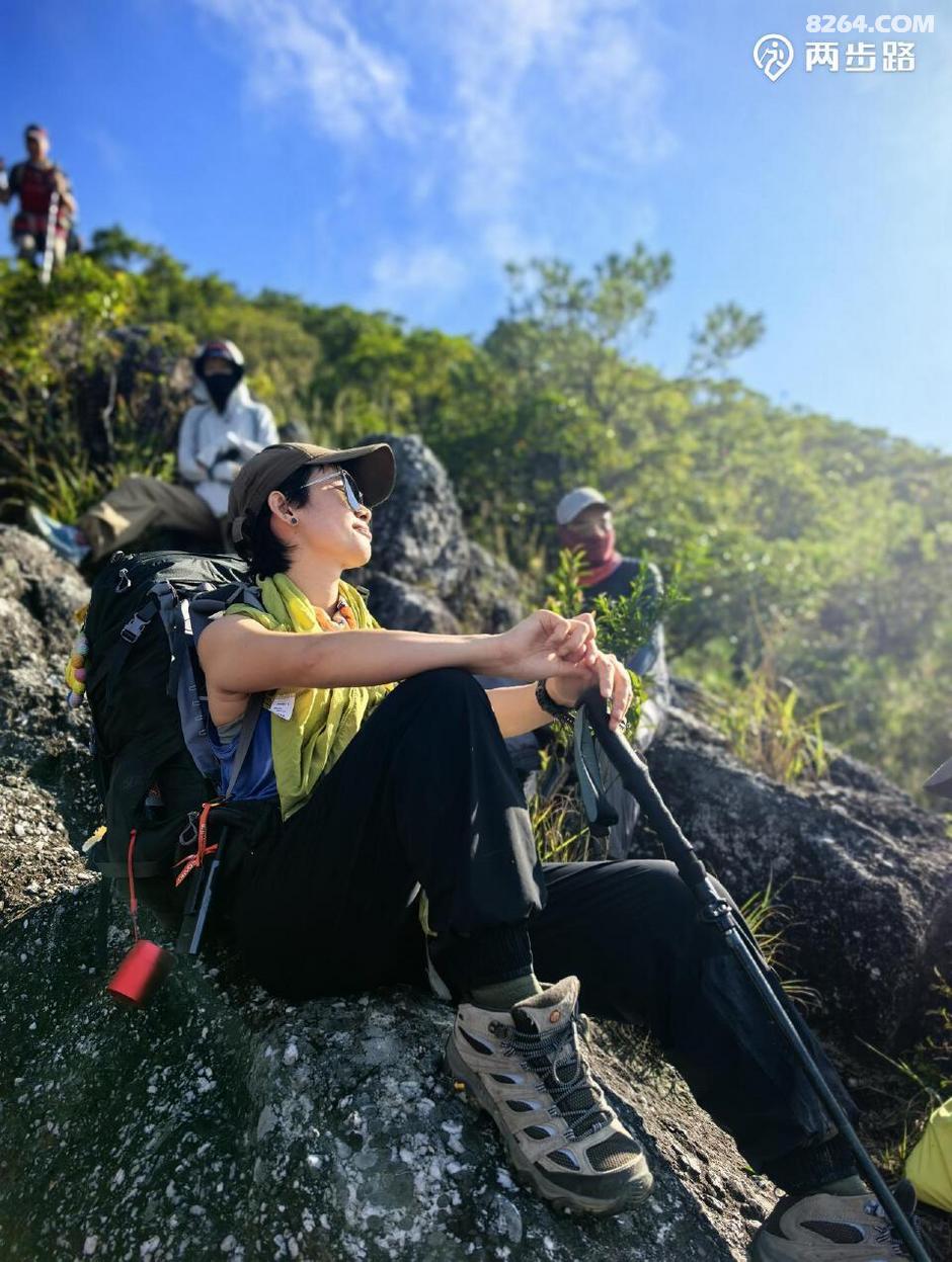 | 走完一段机耕路便开始步入郁郁葱葱的山林,沿着小径爬升。树木交错,阳光被层层叠叠的树叶遮挡,只留下斑驳的光影透过缝隙洒下来。在这里,我们慢慢追上了嘟嘟、浪子、王利、叶子以及阿钊,后面还有杰尼,还有原来走得贼快的阿琳也说要加入我们的慢摇队伍... ...,可能昨晚没有睡好的缘故,大伙似乎走得漫不经心,而且虽偶有凉风吹拂,但天气还是蛮热的,不一会儿,大家便都汗流浃背了,感觉有些虚脱... ...,于是,我们后队便走一段停下来休息一段,一路摆烂,每个人互相分享一些水果,然后慢慢聊心事,悠悠话家常... ...