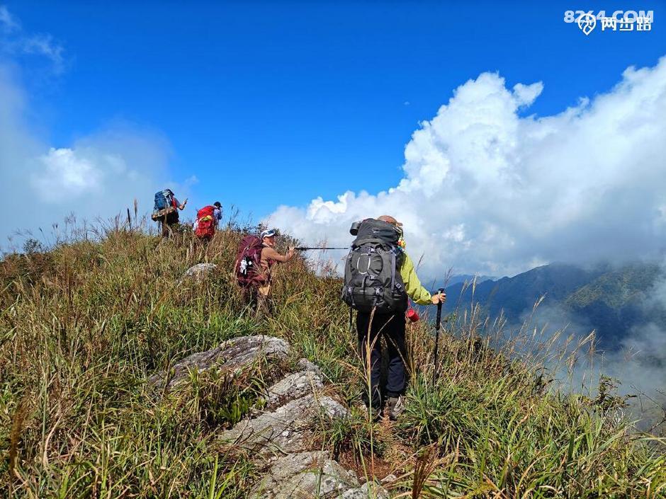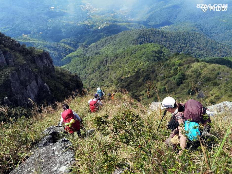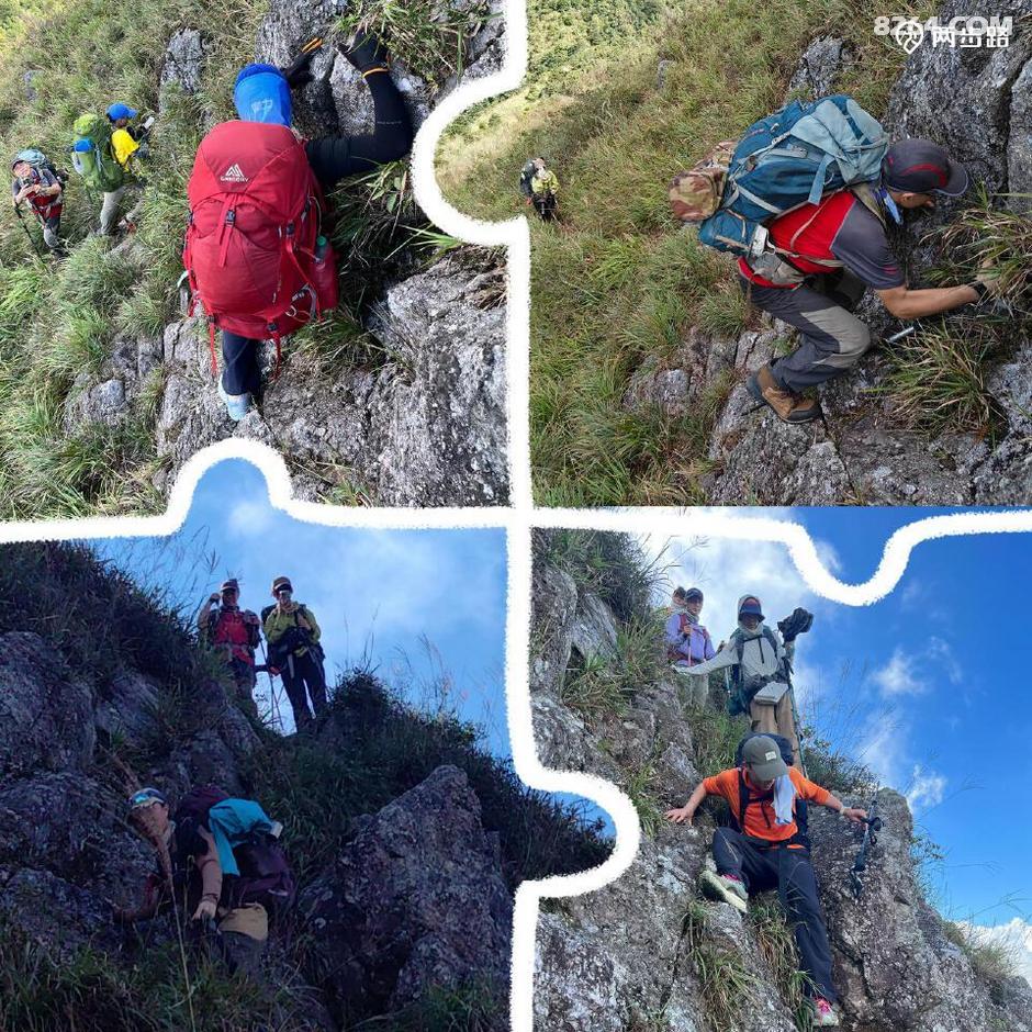 | 我们休息了10分钟左右,便又继续往前,这次我们需要下一小段路,然后再爬升一小段,便来到了一个小山脊,随后便要下一段悬崖,这段悬崖路看似非常的狭窄陡峭,而且路上还有些沙石容易打滑,所以每一步需要特别的小心翼翼。过了这一段,往下还有个更陡的峭壁有一定的落差需要横跨下来,这个位置山势比较险峻,背着大登山包直接往下窜的话整个人容易被背包顶出去,所以,要特别的当心,尤其是腿短的,万一下又下不来,上又上不去,就尴尬了... ... 这里算是这条线的危险点之一了。