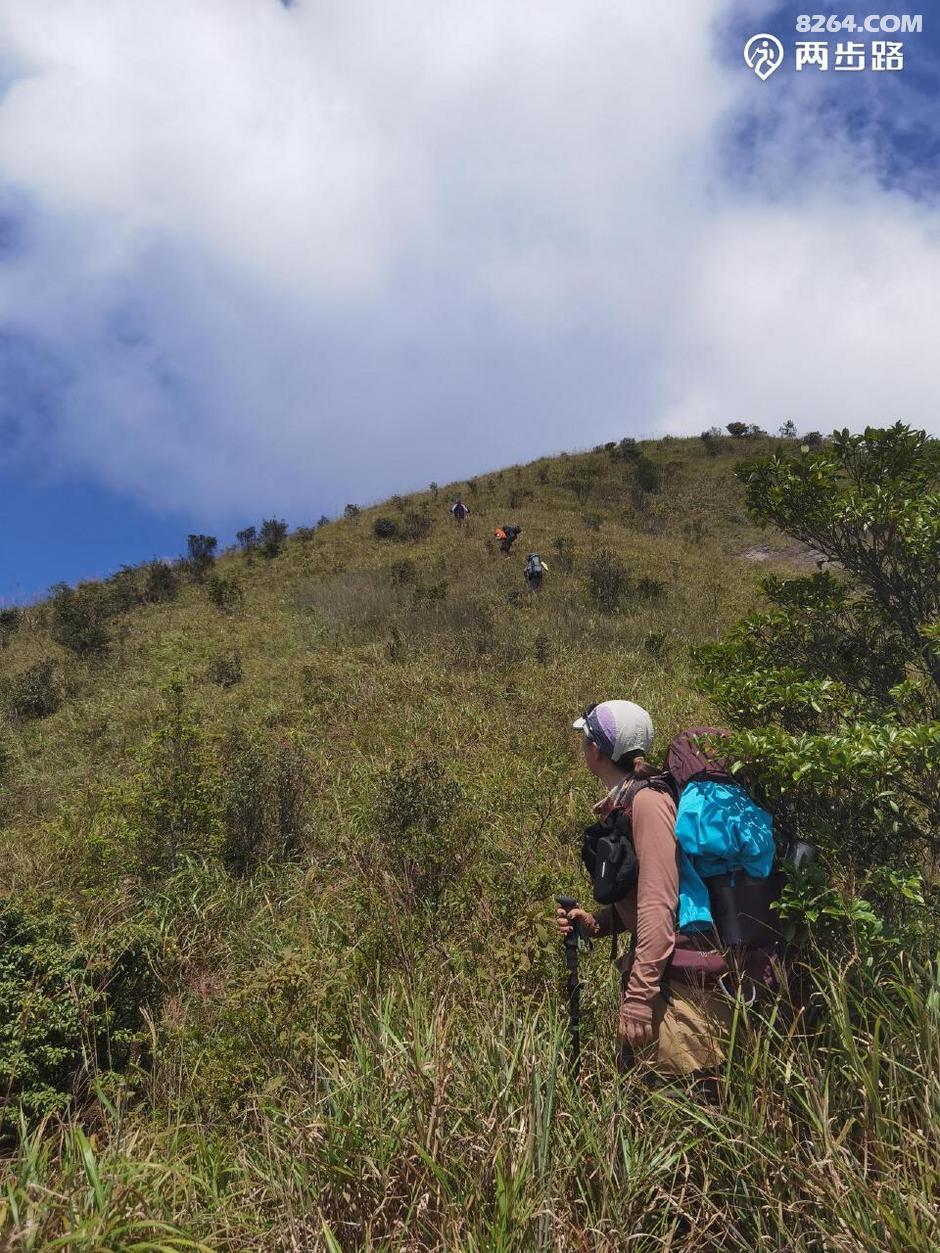 | 休息了十分钟,这下我们要奋发图强了——一条长长的深不见底的陡坡等着我们爬呀爬,一直到山顶鸡公崎(海拔1544米)... ...。而且此刻的太阳光赤日炎炎,热情洋溢,爬一下坡,哗啦啦的流汗跟自来水似的止都止不住... ... “蜀道难,难于上青天”... ... 也就是从这里开始,彼此间的距离开始拉大,我们原本12个人一起走的,慢慢分成了两拨,阿ming在前方不知疲惫的带路遥遥领先,俺和阿琳在后面奋起直追... ...。大伙儿一路上看到有点树荫就赶紧停靠休息,后面上了草甸毫无遮挡只能硬着头皮持续上坡,上午11点左右,我们便上了顶,但是太热了遭不住,我们没有上到鸡公崎的山顶,而是直接顺路拐左往下向乱石坡方向奔去了,偷了点鸡... ...