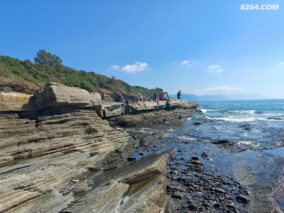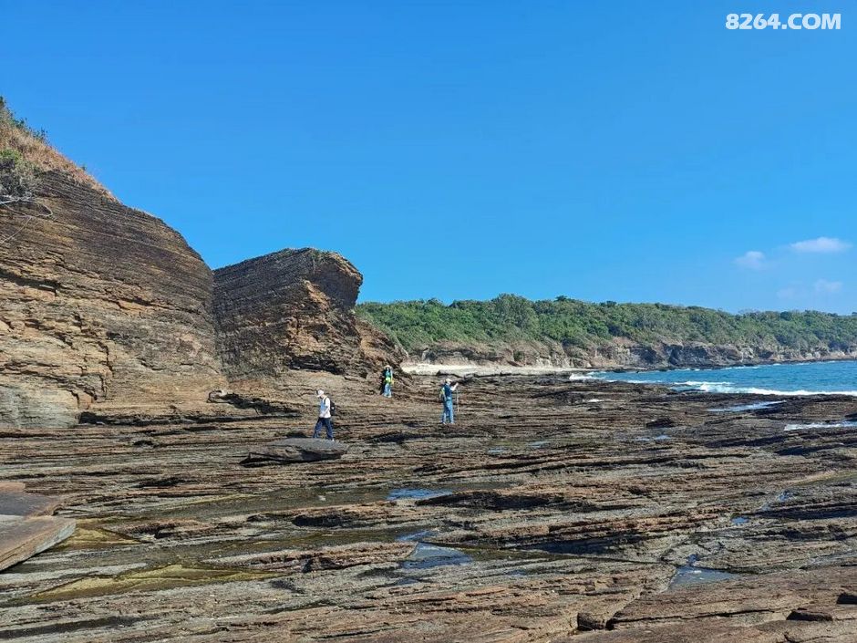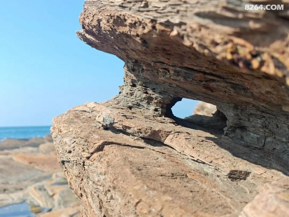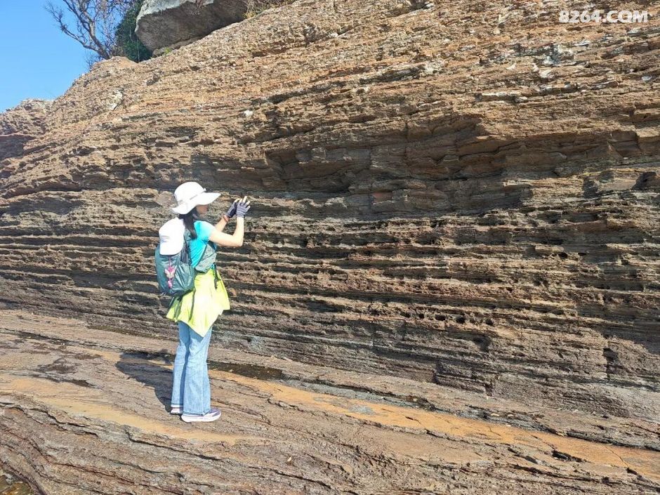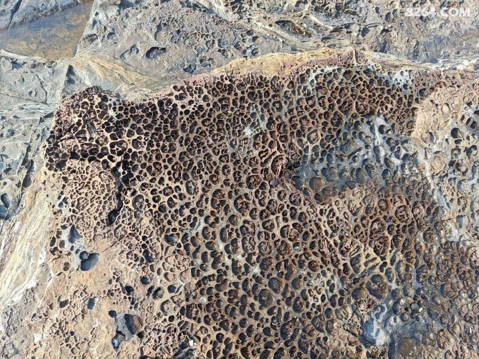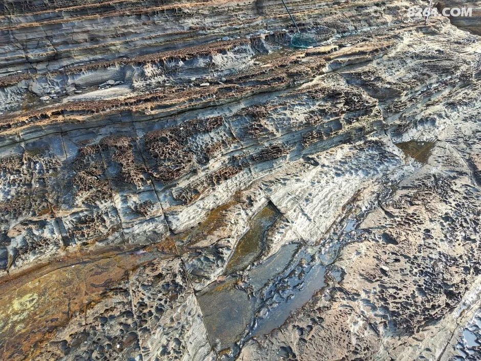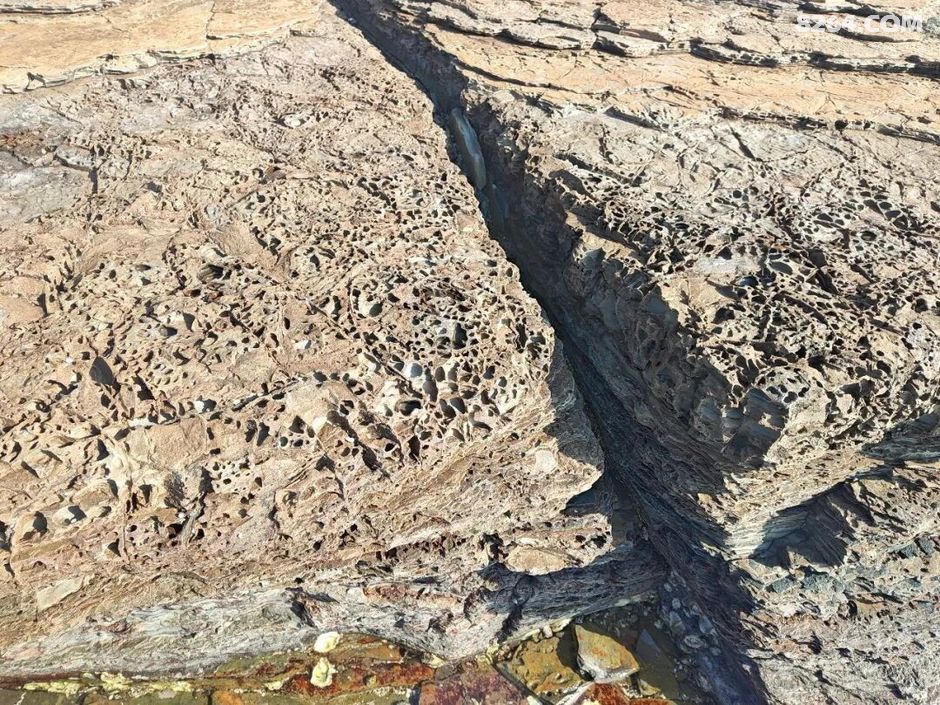 斩颈洲到洲尾角这一段,处处可见千层岩,岩层还布满蜂窝状,这也是海水不断侵蚀加上沙子不断打磨的结果。