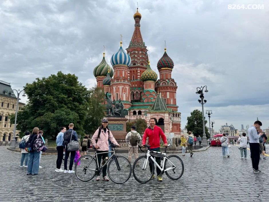 | 莫斯科的街景从不单一,帝国的辉煌、乌托邦的雄心、转型的仓促以及寻常百姓的生活,都被压缩在这同一个空间里。 整座城市像一本摊开的建筑教科书,每一页都写着不同的时代密码。 我们骑着车,在书页间穿行。 雨又下大了,空气湿漉漉的,地上的积水映着灰色的天,克里姆林宫的红墙显得格外清晰。 风一吹,冷得我直哆嗦。我裹紧外套,忽然想和我妈视频。 电话通了,我把镜头转向淋着雨、颜色显得格外浓艳的圣瓦西里大教堂:“妈,快看,红场!” 我妈说:“红肠?我昨天也买红肠了,你那多少钱?贵不贵?” 我笑得手机直晃:“妈!是红场!莫斯科的红场!” “啊,红场呀!”她也乐了,“看见啦看见啦!跟电视里演的一样,你那冷不冷?” 这个瞬间真是奇妙,课本里那个遥不可及的名词,正通过小小的手机屏幕,实时传回老家客厅。而我妈则用最日常的关怀,丈量着这个我曾以为到不了的地方。 那些课本里读来的沉重历史,此刻被一场雨洗得清新而具体。它不再是一个抽象的概念,而是我站在其中、能感到寒冷、闻到花岗岩潮湿气味的地方。 我重新举起手机,认真地把我们和童话般的洋葱顶,一起装进画面。