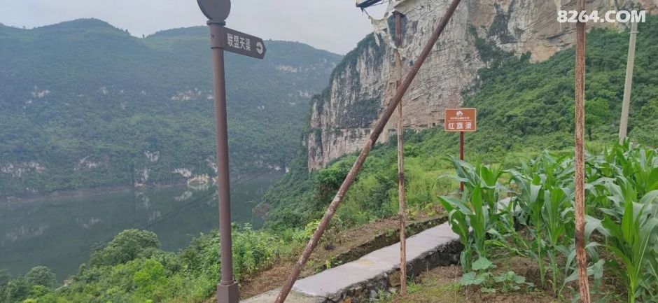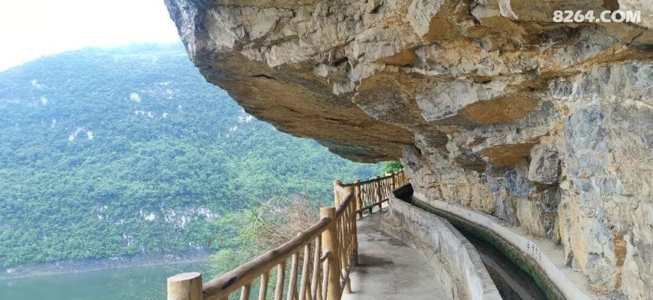 | 一处是金沙县后山镇的“联盟天渠”是后山镇境内历史最久、工程最大、工期最长的一条人工渠。始建于20世纪中叶,历经十余年方建成。在哪杵河中段拦坝引水至原联盟大队,渠成使原双联村学堂、平义、和平、李家寨及原合心村肯池上千亩旱地变成旱涝保收的良田。全渠从半岩中横穿而过,最高处距岩脚乌江河谷200米,全长4.8公里,最宽2米,最深1.5米,全部系人工开凿,工程艰险耗资巨大,被誉为后山的“红旗渠”。之后金沙县移民局曾多次投资对渠道进行防渗加固,后山镇2013年投资近50万元,对最险处沟坎筑栏护之,开将其纳入贵州登山健身步道”体系,使之成为一处难得的旅游景观。