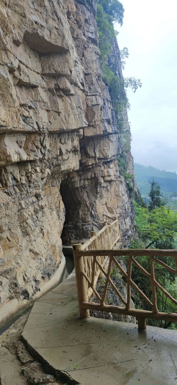 贵州是典型的喀斯特地貌地区。地层大多数由石灰岩、白云岩等可溶性碳酸盐岩构成,在长期地质作用下,内部充满了“孔隙”和“裂隙”。雨水落下后,就像水倒在了满是裂缝的石头或海绵上,没有形成表面径流,而是迅速从这些缝隙中下渗,大部分水资源被储存在地下。在缺乏现代设备和技术的年代,人们想要有效利用这些深藏地下的水极端困难。形成了“山下河水哗哗流,山上用水贵如油”的奇特景象。但勤劳淳朴的贵州人民,用他们的汗水、鲜血甚至生命,开凿“红旗渠”,共同书写了一段段劈山引水的传奇故事。 在毕节的大山深处就有两处知名度不高,却很值得一看的“红旗渠”。一处是贵州省毕节市七星关区生机镇高流村的“绝壁天渠”(又称“高刘大渠”“高流天渠”)。该渠1958年6月动工,1966年竣工,其中主渠6公里左右,其中临崖段有1.757公里(该段防护设施还未完备,请务必谨慎前往),支渠12公里。有三位前辈刘明志、陆振华、许光美在修建水渠时不幸牺牲,立有无字碑。虽未蒙面,深受其恩,吾等后辈应当谨记于心。