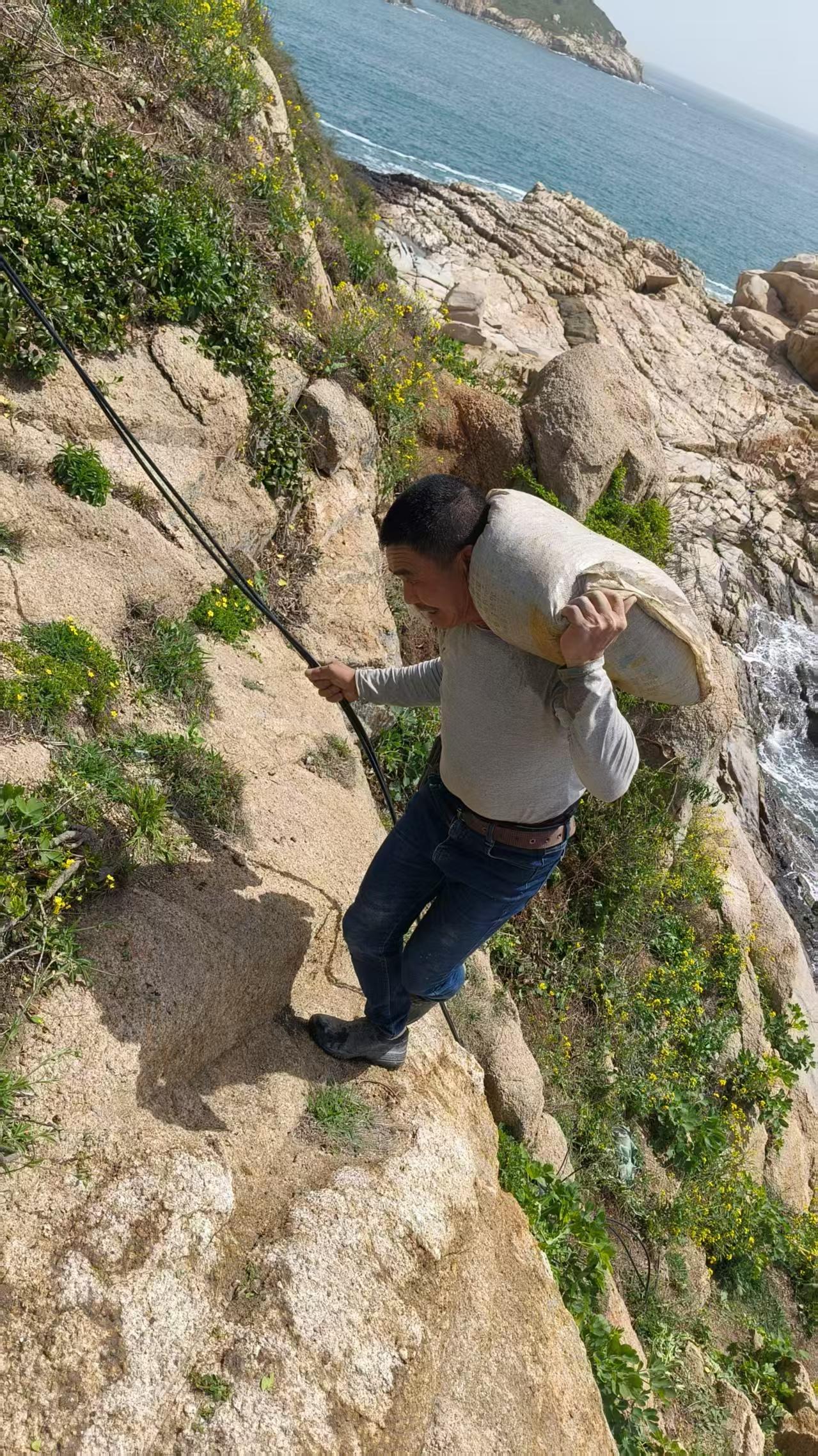 工人扛砂石上岛铺设中华凤头燕鸥保育区。