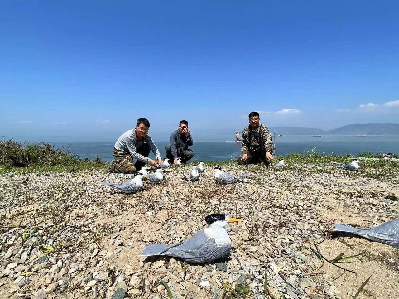 志愿者们没有因此放弃,2022年,保育小组继续上岛恢复生境,布设招引,并优化了假鸟模型和声音设备。功夫不负有心人,终于在当年5月底,南屏屿陆续吸引了3巢共7只中华凤头燕鸥,及800多只国家二级保护野生动物大凤头燕鸥。