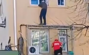 北京石景山区一老人被困窗外,一外卖员徒手攀爬与消防员合力救援