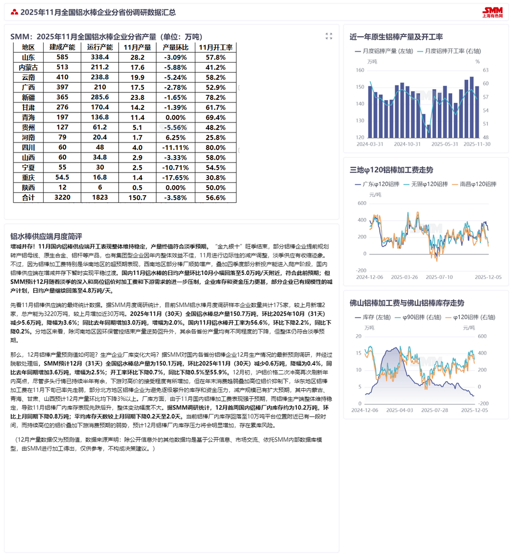 先看11月铝棒供应端的最终统计数据。据SMM月度调研统计,目前SMM铝水棒月度调研样本企业数量共计175家,较上月新增2家,总产能为3220万吨,较上月增加近30万吨。2025年11月(30天)全国铝水棒总产量150.7万吨,环比2025年10月(31天)减少5.6万吨,降幅为3.6%;同比去年同期增加3.0万吨,增幅为2.0%。国内11月铝水棒开工率为56.6%,环比下降2.2%,同比下降0.2%。分地区来看,除河南地区因环保管控结束产量逆势回升外,其余各省份产量均有不同程度的下降,但整体仍符合淡季预期。