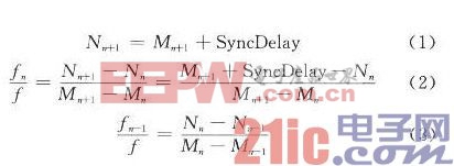 要实现两个时钟的同步,一是时钟的计数值要相同,二是计数增长速率要相同。如图1所示,设主时钟的频率为f,从时钟频率在Nn-1到Nn时间段为fn-1,在Nn到Nn+1为fn,SyncDelay为同步报文从主站到从站的延迟时间,可以通过延时测量帧采用往返法测量得到,从时钟要在Nn+1时刻达到与主时钟相等,那么有: