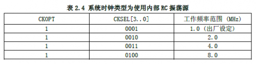 ATmega16可以使用多种类型的系统时钟源,最常用的为2种:使用内部的RC振荡源(1M/2M/4M/8M)和外接晶体(晶体可在0-16MHz之间选择)配合内部振荡放大器构成的振荡源。具体系统时钟类型的配置由CKOPT和CKSEL[3-0]共5个熔丝设定,表2.4、表2.5给出了具体的配置值。用户在使用中,首先要根据实际使用情况进行正确的设置,而且千万注意不要对这些熔丝位误操作!