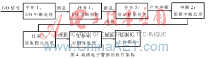 (2) 任务1等待I/O中断的消息,收到消息后,判断I/O逻辑,确定是否进行抓拍。如果进行抓拍,则向任务2(启动抓拍任务)发出抓拍消息。