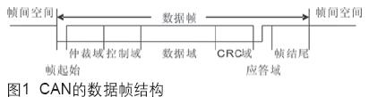 CAN总线的信息以几个不同的固定格式的报文发送,报文传输有四种不同类型的帧:数据帧(Data Frame)、远程帧(Remote Frame)、错误帧(Error Frame)和过载帧(Overload Frame),数据帧和远程帧可以使用标准帧和扩展帧2种不同格式,不同之处在于标识符域的长度分别为11位和29位。CAN的帧(Frame)由不同的位域(Bit Field)组成,以最重要的数据帧为例介绍帧的结构,数据帧包括7个不同的位域:帧起始、仲裁域、控制域、数据域、CRC域、应答域和帧结尾(如图1所示)。