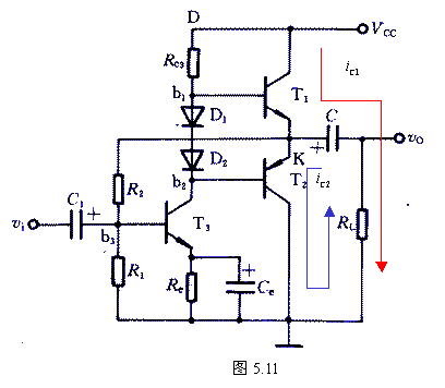 上述情况是理想的。实际上,图5.10的输出电压幅值达不到Vom= Vom/2,这是因为当vi为负半周时,T1导电,因而iB1增加,由于RC3上的压降和VBE1的存在,当K点电位向+VCC接近时,T1的基流将受限制而不能增加很多,因而也就限制了T1输向负载的电流,使RL两端得不到足够的电压变化量,致使Vom明显小于VCC/2。