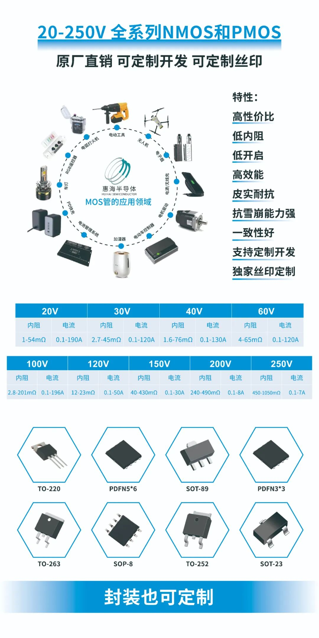 H6261S搭配我司的MOS管使用,可充分发挥其优势,为音响提供高效、稳定的使用体验。我司还拥有20V至250V不同电压值的NMOS和PMOS全系列产品,封装类型包括PDFN3*3、PDFN5*6、TO-252、SOP-8、SOT23、SOT89-3、TO-263、TO-220等,且产品持续更新中。