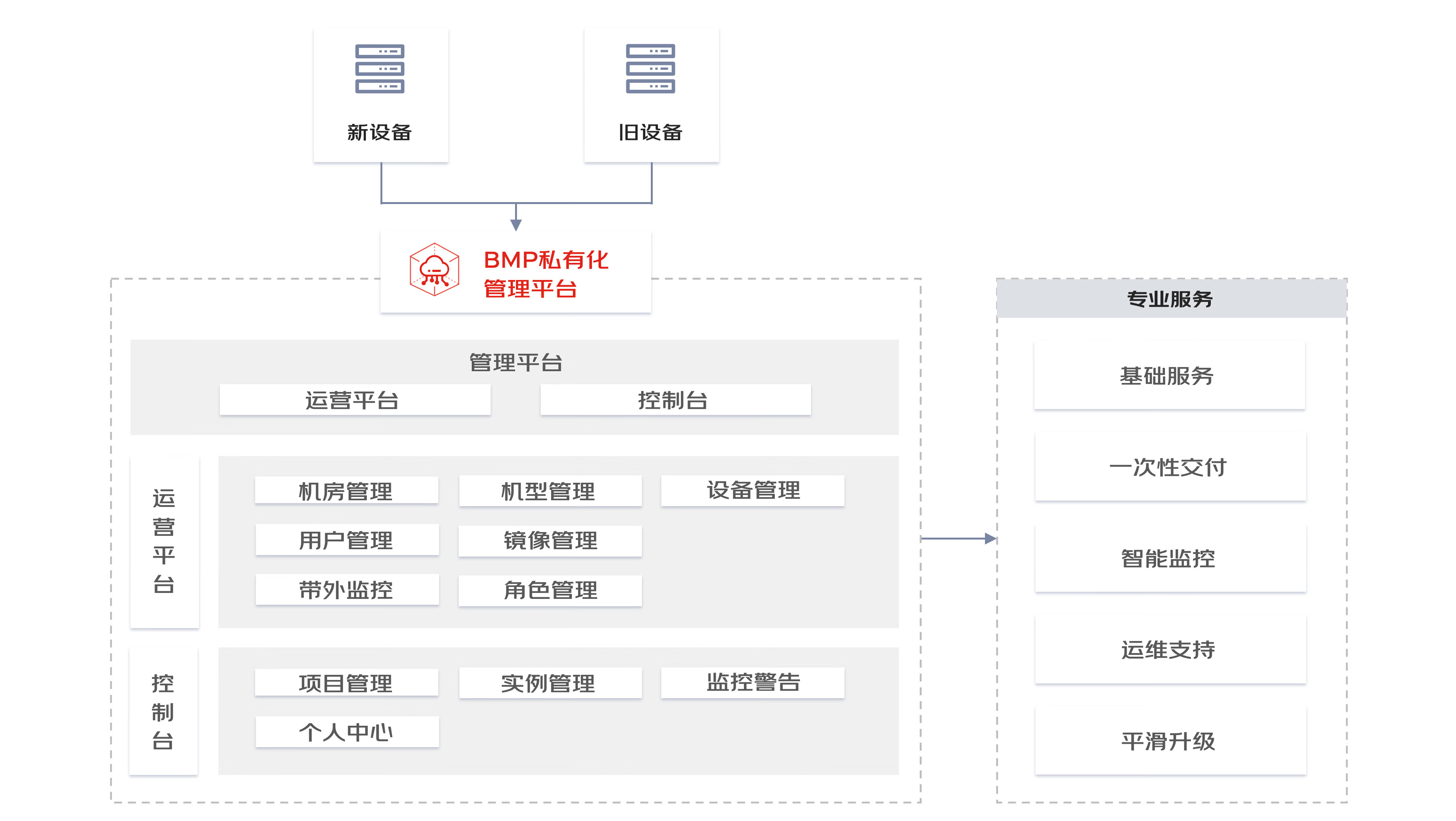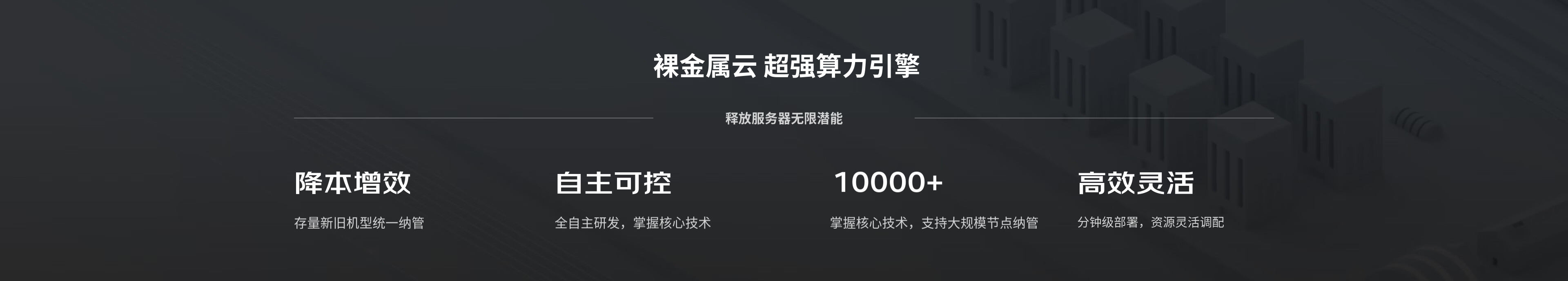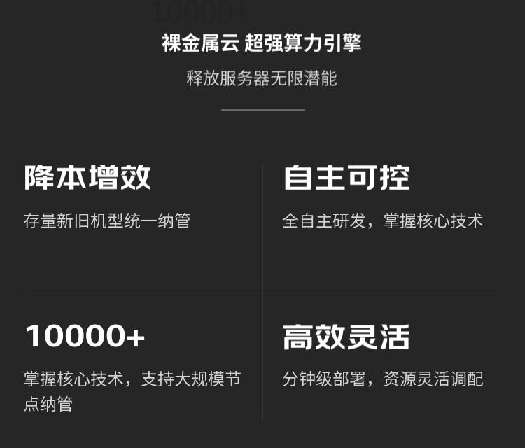 无差别对待新旧设备,不需要加装额外硬件,不增加额外成本,资源统一纳管,本地私有化部署,线上自助管理使用,控制台&运营平台一站式交付。