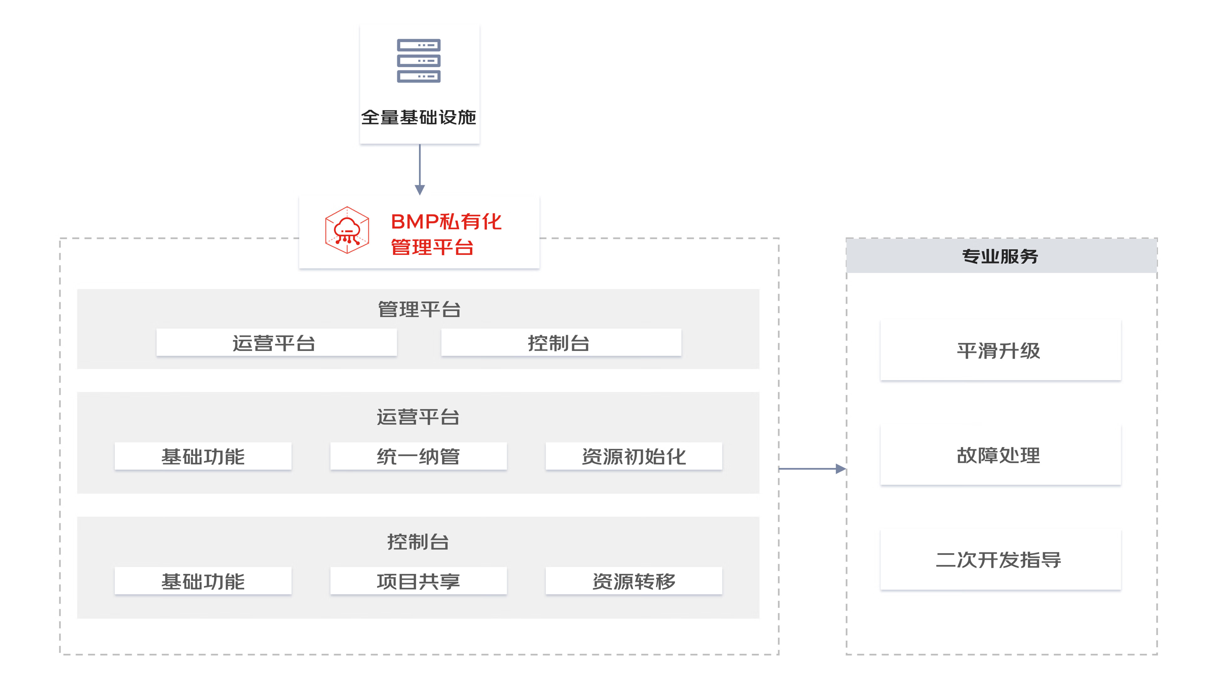 纳管全量基础设施:服务器资源统一纳管,预置多种OS镜像,分钟级资源初始化,快速响应复杂业务需求 基于项目的聚合资源管理:资源以项目维度聚合,可快速进行资源共享和资源转移,提升资源使用效率 专业服务:通过订阅专业版,支持系统平滑升级,远程及现场故障处理,以及二次开发指导