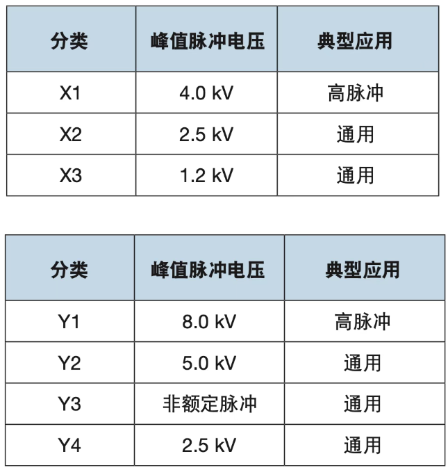 按照应用场景,安规电容被分为X和Y两类,前者跨接于火线和零线之间,用于抑制差模干扰,后者则跨接在火线与地、零线与地之间,用于抑制共模干扰。根据安规电容的具体应用,特别是其抗峰值脉冲电压的能力,X和Y电容又被细分为不同的等级,如图2所示。