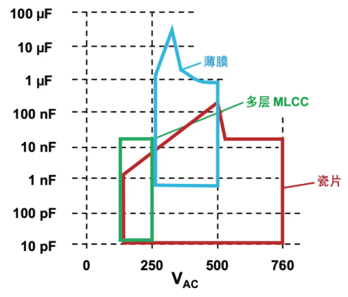 在安规电容选型时,工程师需要根据设计规范的要求,通过电容值、额定电压、抗脉冲强度等关键参数,遴选出合适的物料。不过现实的情况往往比这个更为复杂:工程师会面对着不同种类的安规电容器选项,包括薄膜电容、MLCC、陶瓷片式电容等,虽然从性能参数上看它们之间有所区隔,但是还是有相当大的一部分“交集”(如图3 )。这时,就需要以更广阔的视角,综合考量更多的要素——比如可靠性、外形、成本等等,做出明智的技术决策。