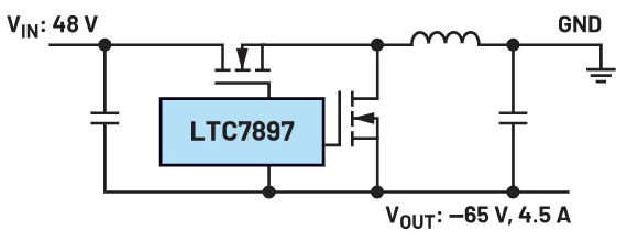 图3显示了LTC7897在反相拓扑中将48 V电源电压转换为-65 V输出电压。