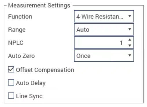 您还需要确保启用Offset Compensation(偏置补偿),因为此设置可以通过消除热偏移来进一步提高电阻测量精度。其他设置,例如Range(量程)、NPLC和Auto Zero(自动归零) 也可以调整,以进一步提升测量精度。