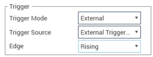 触发功能可在KickStart中完成配置,只需将Trigger Mode(触发模式)设置为External(外部触发):