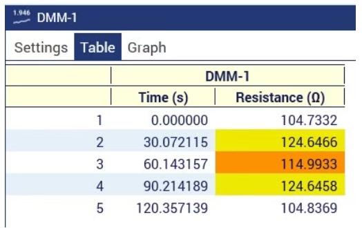 解读测量数据落在设定限值之外、即超出电阻额定容差的测量结果,会在KickStart的Table(表格)标签页中高亮显示: