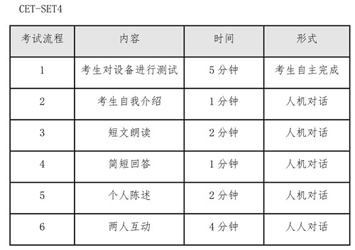 大学英语四、六级口语考试主要考核学生的英语口头表达能力,具体为:就熟悉话题进行比较流利的会话能力;表达个人意见、情感、观点的能力;陈述事实、理由和描述事件的能力。考试采用计算机化考试。考生在计算机上进行考生与模拟考官、考生与考生之间的互动。请提前登录全国大学英语四、六级考试网站(cet.neea.edu.cn),熟悉考试流程。考试内容及时间分配如下表所示: