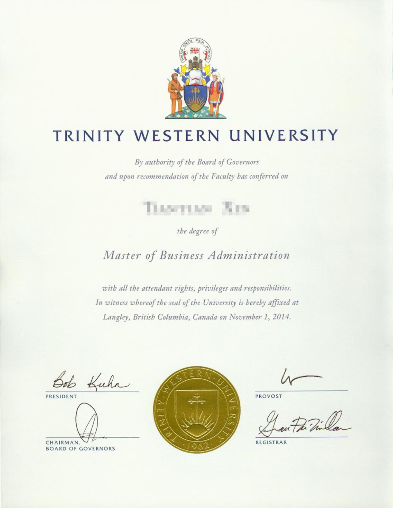 2、学位:加拿大西三一大学MBA学位证书,该证书获得中华人民共和国教育部认证,具有研究生相应学历和学位。