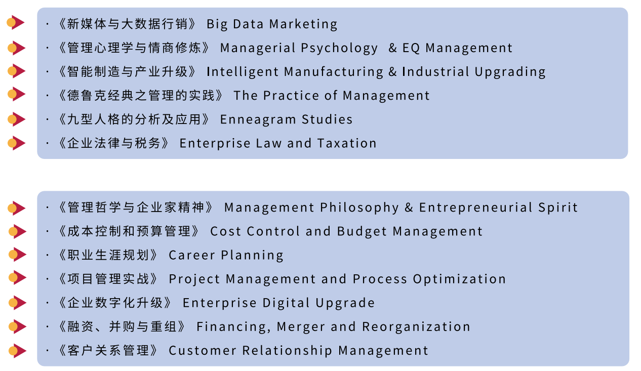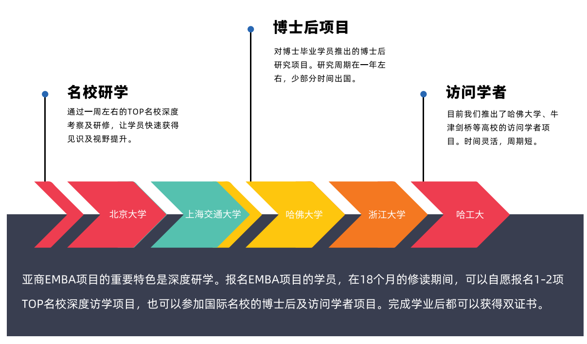 亚商EMBA另外一个重要特色是双证目。学员在修读亚商课程期间,还会安排1-2场国内TOP高校深度研学课程。学员完成课程后除了获得亚商毕业证书,还可以获得顶级名校结业证书。同时亚商EMBA毕业学员也可以申请对接海外高校的博士学位课程。