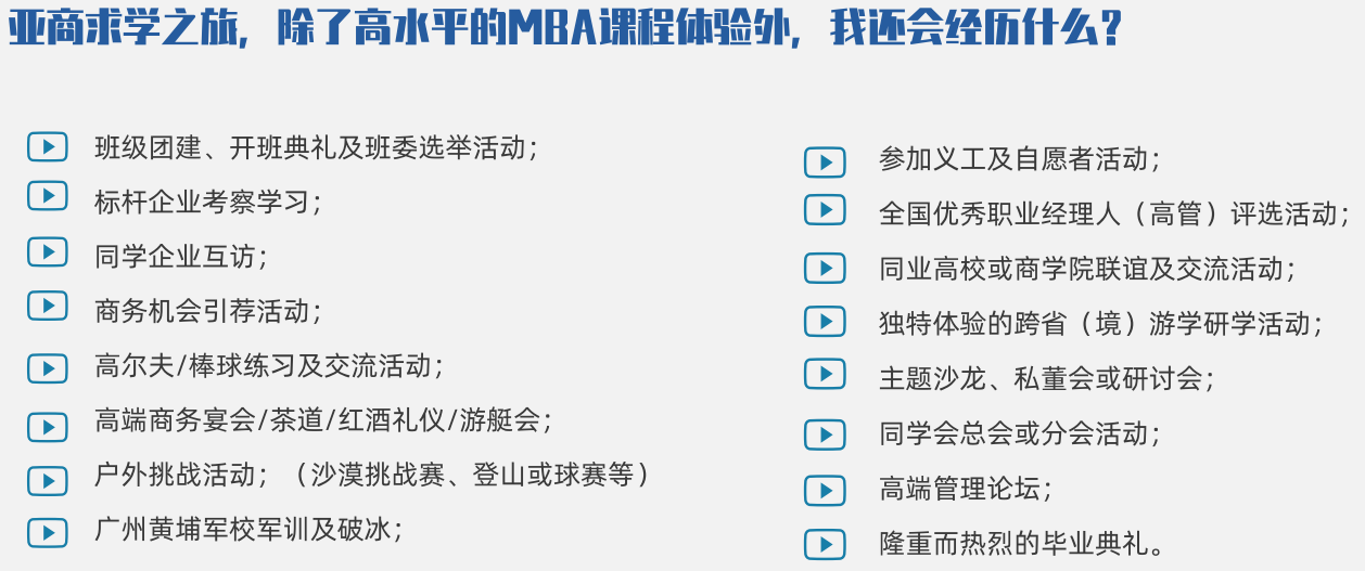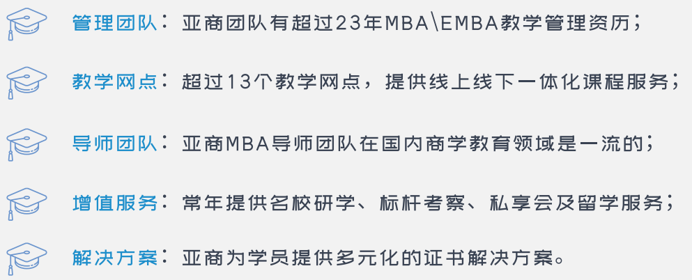 2、亚商MBA分为15门核心课程及20多门选修课。一名合格的亚商毕业生至少需要修读20门专业课程,并完成高质量论文。