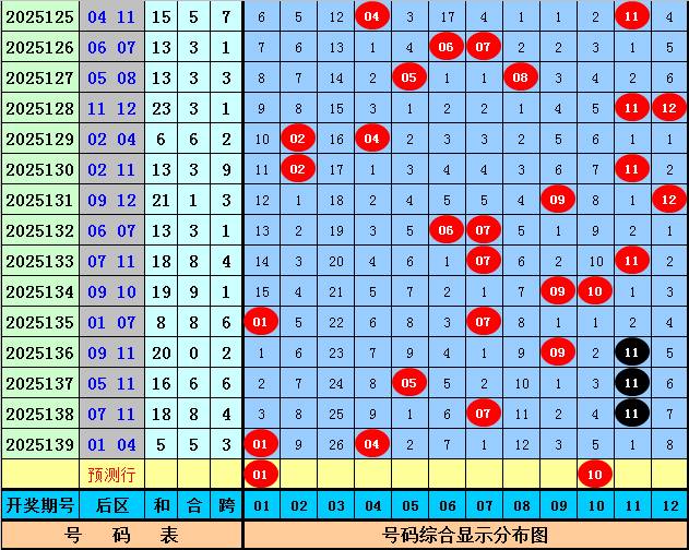 后区奖号分析:上期后区开出奖号01+04,奖号和值为5,跨度为3,本期后区注意和值走大,参考两码01 10。