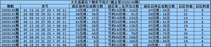 体彩大乐透第2025139期奖号为:08 18 22 30 35+01 04,前区号码大小比开出4:1,012路比开出2:1:2,奇偶比开出1:4,后区号码和值开出5,跨度开出3。