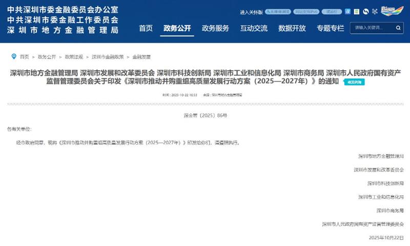 10月22日,深圳市地方金融管理局、深圳市发展和改革委员会、深圳市科技创新局、深圳市工业和信息化局、深圳市商务局、深圳市人民政府国有资产监督管理委员会联合印发《深圳市推动并购重组高质量发展行动方案(2025—2027年)》(简称《方案》), 提出在集成电路、人工智能、新能源、生物医药等战略性新兴产业领域,支持“链主”企业、龙头上市公司等开展上下游并购重组。