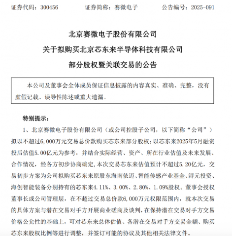 根据公告披露的交易方案,赛微电子计划向芯东来原股东海南依迈、智能传感产业基金、浔元投资、海创智能装备分别收购其持有的4.11%、3.00%、2.80%和1.09%股权。本次交易完成后,赛微电子将合计持有芯东来不超过11%的股权,后者将成为其参股子公司。