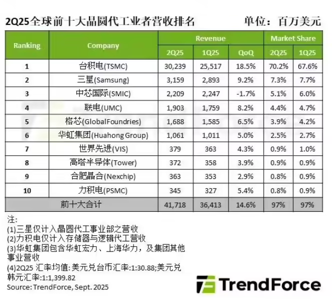 集邦咨询:2025 年 Q2 晶圆代工营收猛增 14.6% 创新高,台积电独占 7 成市场