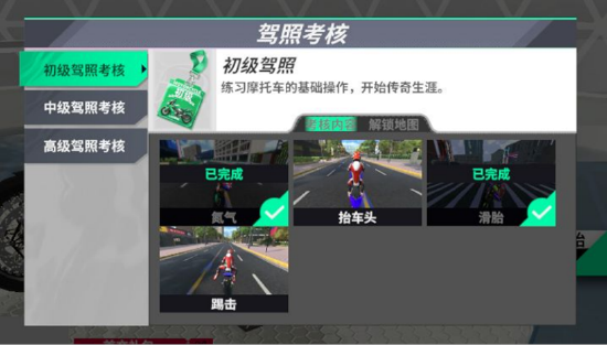 初级→中级→高级,逐步解锁氮气、抬车头、滑胎、踢击等核心技巧