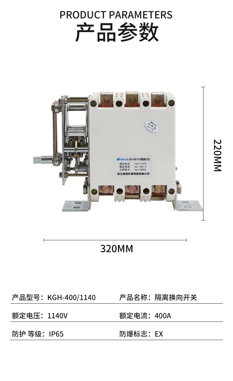 本系列隔离换向开关适用于交流50HZ,电压至1140V,电流分别为200A,315A,400A的电力线路中,作主电路隔离和在无负载情况下改变电源相序用,在故障情况下,能带负荷分闸,具有较高的分断能力,特别适宜于组成千伏级矿用隔爆型电磁起动器.