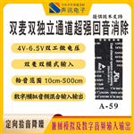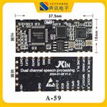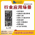一,产品概述: A-59是一款高性能的数字语音处理模块,针对所有免提全双工通话设备中的回音问题进行 消除(AEC),并具环境噪音压制(ENC)功能,及定向拾音(BF)功能,让通话设备获得更好的语音品 质 A-59的优异处理性能,可以在消除大音量喇叭声音的同时,并保持全双工的流畅度, 可以让语音识别及交互设备更准确的提高语音识别率。 A-59 可以在喇叭音量 95DB 左右时,麦克风靠近喇叭 1CM 处,也能完全屏蔽喇叭回 音。只要保证结构本身的稳定合理,即使喇叭及咪头的距离小于6CM,喇叭的音量大于100DB, 选用 A-59 模组同样可以达到消除回音的效果,并保证通话的流畅。 A-59 在具有强力消回音功能的同时,还具有远场拾音功能(AGC),在开启远场程序时, 麦克风的拾音范围可以达到 50-500CM(常规灵敏度-42DB 麦克风),满足大空间的拾取要求。 A-59 采用 AI 神经网络降噪技术是一款革命性的语音处理技术,他突破了传统单麦克风和 双麦克风降噪的局限性,利用采集的各种日常环境中的噪音样本进行训练学习.让降噪算法具 有自适应噪声抑制功能,可以根据实际情况自动调整噪声抑制等级 A-59 的接口丰富,可以数字音频和模拟音频输入输出,数字模拟音频混合方式使用,可以 满足各类应用设备的不同接口适配,快速完成项目设计。 模块端口采用半孔焊盘设计,体积小巧(长 37.5mm,宽 16mm)。在已成型的产品中,可 以通过转接板快速接入;而在新产品设计时,则可以按模块尺寸图,直接做焊盘形式焊接在 系统板上,方便各类产品的设计生产使用。(此型号可以兼容替换 A-29,A-09,A-06 模块)