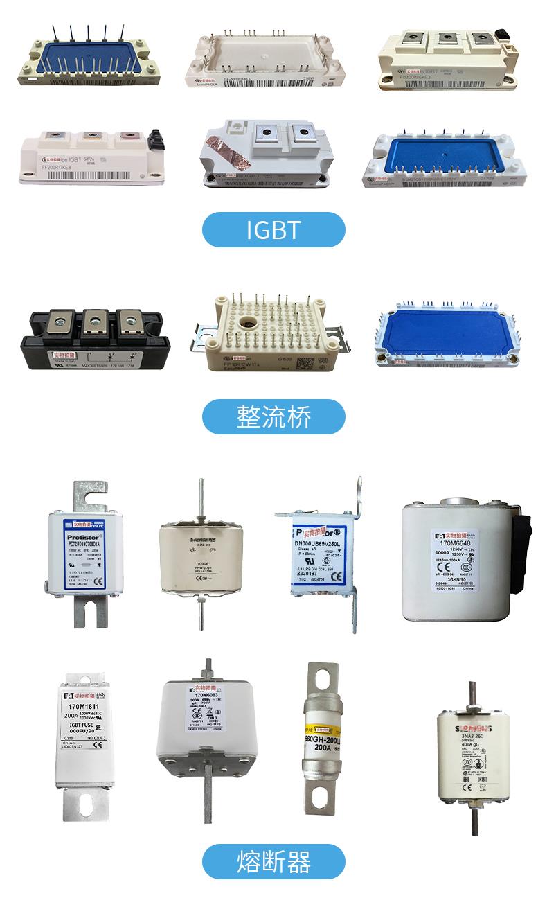 销售品牌 1、Infineon(英飞凌)、FUJI(富士)、MITSUBISHI(三菱)、SEMIKRON(西门康)、全系列IGBT产品; 2、Infineon(英飞凌)、SEMIKRON(西门康)、IXYS(艾克赛斯)、SANREX(三社)、WESTCODE(西码) IR(美国国际整流器)、VISHAY(威士)、全系列可控硅、整流桥、二极管模块,西门子熔断器、美国Bussmann熔断器,固态电器等品牌。