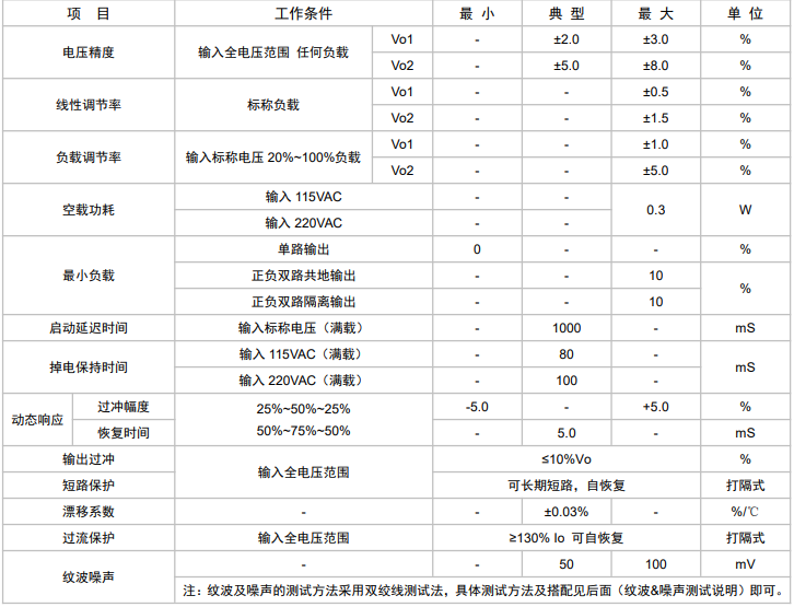 注3:表格中满载效率(%,TYP)波动幅度为±2%,满载效率为输出的总功率除以模块的输入功率。