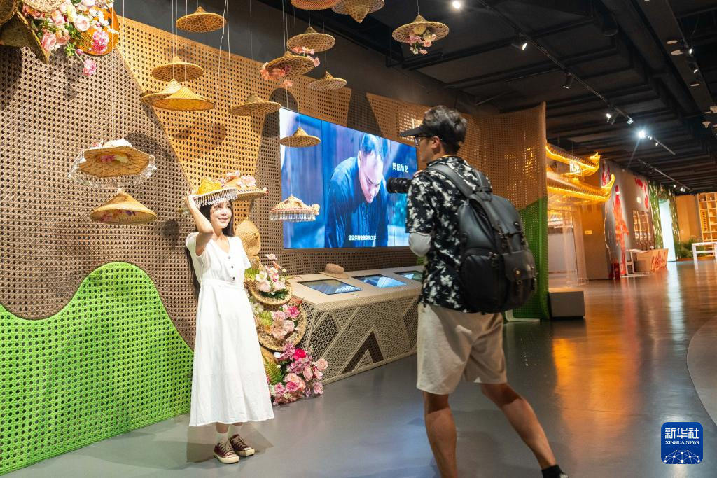 9月16日,在湖南省怀化市五溪非遗园,游客(左)在试戴黔阳竹艺编制的帽子。