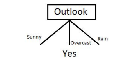 由于在天气预报(Outlook)特征为多云(overcast)时,因变量的结果仅仅有“Yes”这一种类别,因此我们可以将其设置为“Yes”。这意味着如果天气预报(outlook)特征为多云(overcast),我们就可以踢足球。现在我们的决策树如下所示。