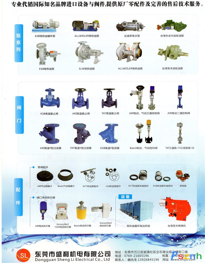 东莞市盛利机电有限公司系为德国Allweiler导热油泵浦、德国KSB导热油泵浦、阀门及台湾WU-FUNG(吾丰)燃烧机系列的一级经销商,本着“诚信服务、永续经营”的理念,专业代销售国际知名品牌进口设备与阀件,并提供原厂零配件及完善的售后技术服务。
