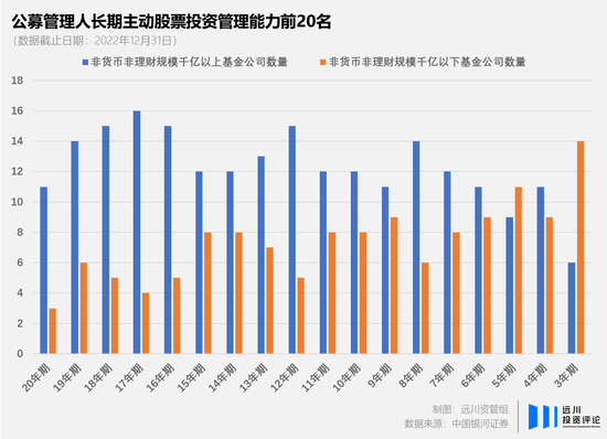 在银河证券发布的《公募基金管理人长期主动股票投资管理能力榜单(20221231)》中,在过去16~20年期业绩上,老牌基金公司仍然占有一定优势。7~15年期业绩开始陆续有千亿以下基金公司上榜,而在过去3~5年的业绩排名中,“中生代”基金公司正在崛起。