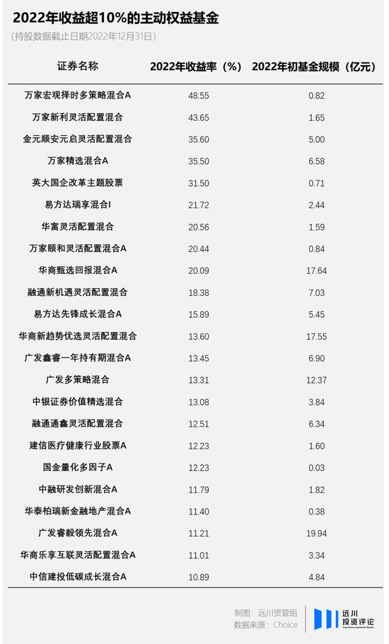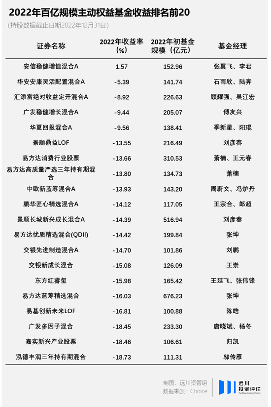 在2022年的主动权益收益超过10%的基金中,没有一个基金产品的规模在2022年初超过50亿,也少有出现我们印象中那些头部基金公司的产品。与之形成对比的,是2022年百亿级基金的收益,除了张翼飞、李君管理的安信稳健增值实现正收益之外,百亿基金的收益全军覆没。
