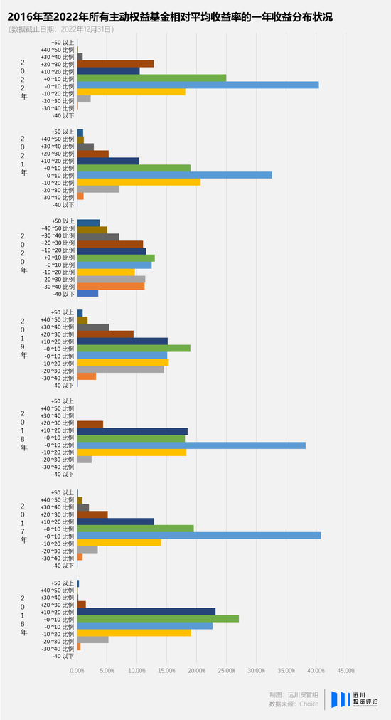 通过统计2016年至2022年主动权益基金收益分布的状况可以发现,在2019年之前,只有极个别基金能做到超过平均收益率40%以上的收益。但2019年至2021年,这样的基金的数量逐渐超过三位数。并且收益排名最靠前的一批基金与平均收益拉开的差距甚至达到了100%左右,这在之前也是极少出现的情况。