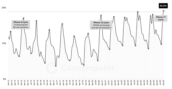 此外,更丰富的产品组合(包括iPhone 16e及更多延续销售的旧款机型)以及新兴市场的增长,也进一步推动了苹果在10月的表现。
